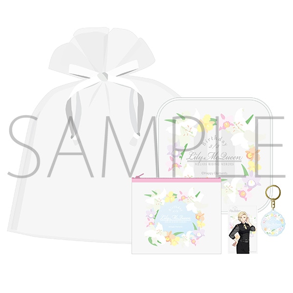 税込【商品サイズ】ポーチ:約15×14cm、ミニタオル:約20×20cm、アクリルキーホルダー:全長約9.5cm、カード:約9.1×5.5cm、オーガンジー巾着:約34×26cm